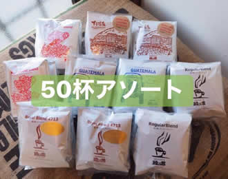 例: <50杯アソートA> レギュラー10杯・モカ10杯・グアテマラ10杯・ロイヤル10・下呂5杯・高山10杯